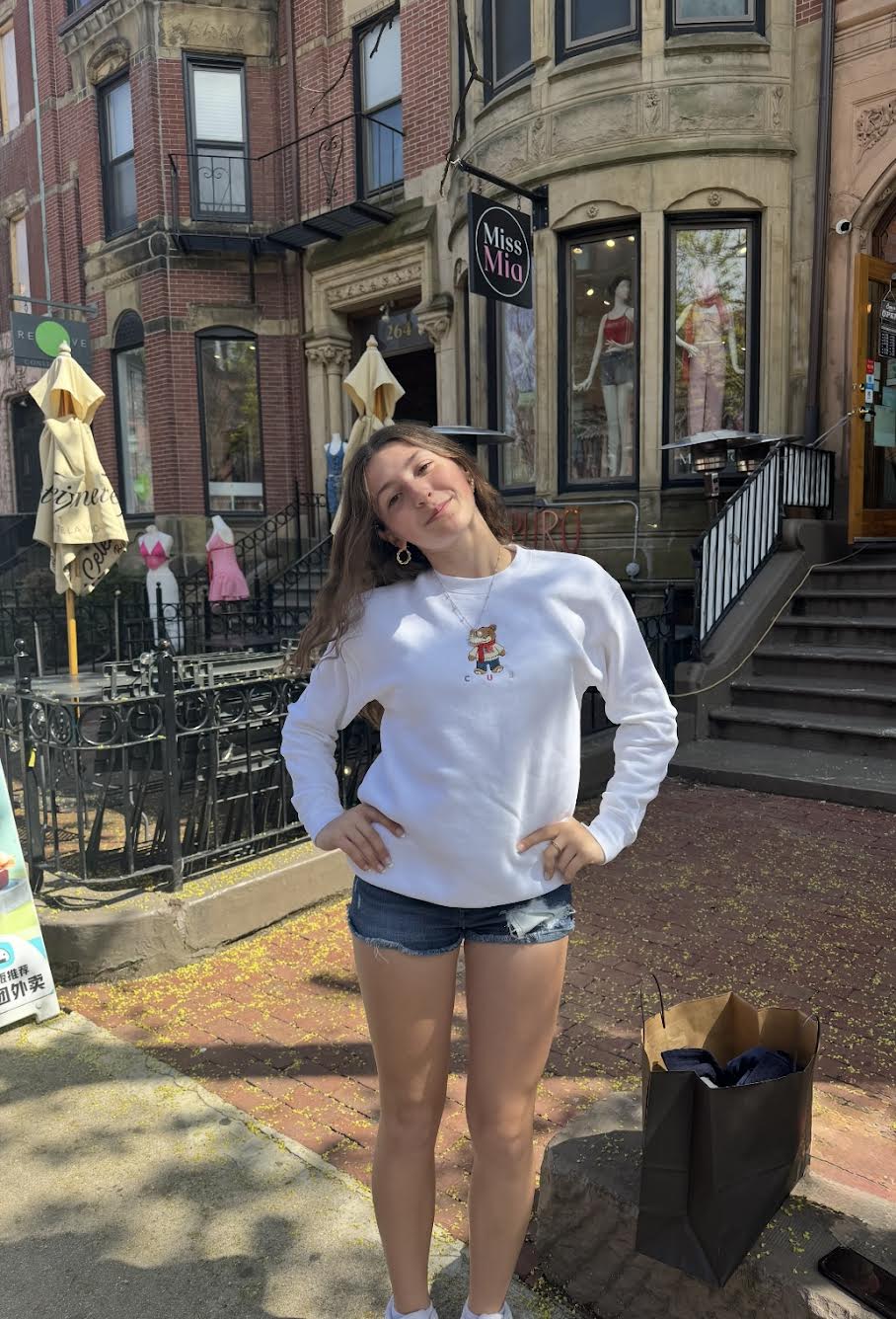 The All-American Cub sweatshirt brings cozy charm and classic patriotism together. Front and center is an embroidered teddy bear standing proudly in a beige sweater featuring an American flag paired with denim shorts and a red scarf for a timeless look. This soft white pullover adds a nostalgic, preppy flair to any outift-perfect for latering on crisp days or celebrating national holidays.